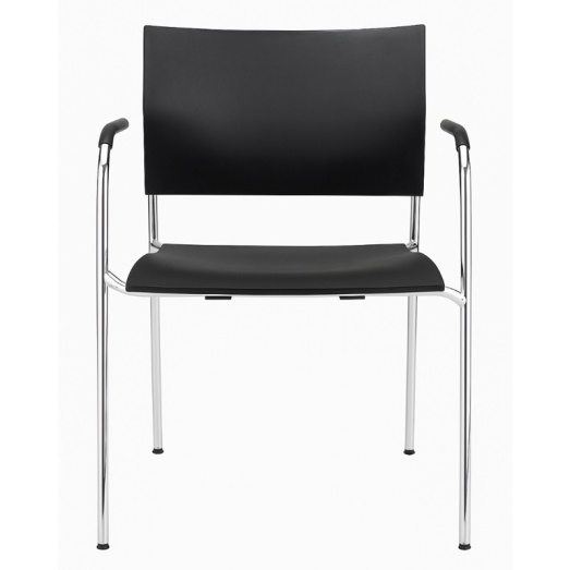 Delphin Design, iF Award 2001stapelbar und in Reihe verkettbarGestell Rundrohr verchromt 18mmungepolstertArmauflagen ElastomerkunststoffSitz und Rücken getrennt KunststoffFarbe schwarz, Sitzhöhe 45cmBreite 58cm, Tiefe 55cm, Höhe 82cm