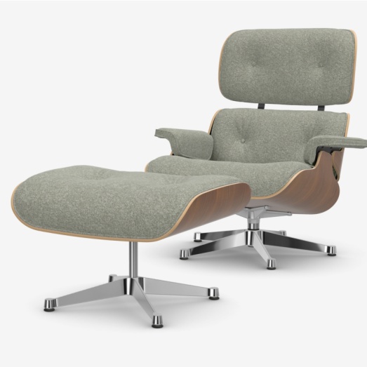 Design Charles & Ray Eames 1956Fuß komplett Alu poliertSchale Nussbaum schwarz pigmentiertBezugmaterial Stoff 0500 Nubia Farbe 09 elfenbein/forestinkl. Filzgleiter für ParkettHocker B 63cm, H 42cm, T 56cmChair B 84cm, T 85cm, H 89cm