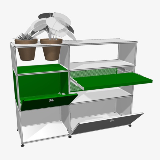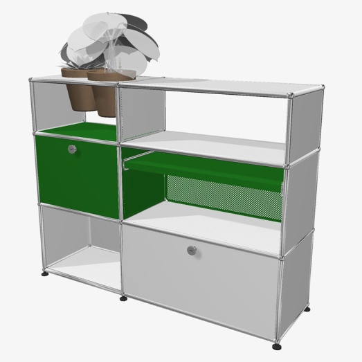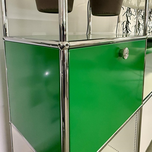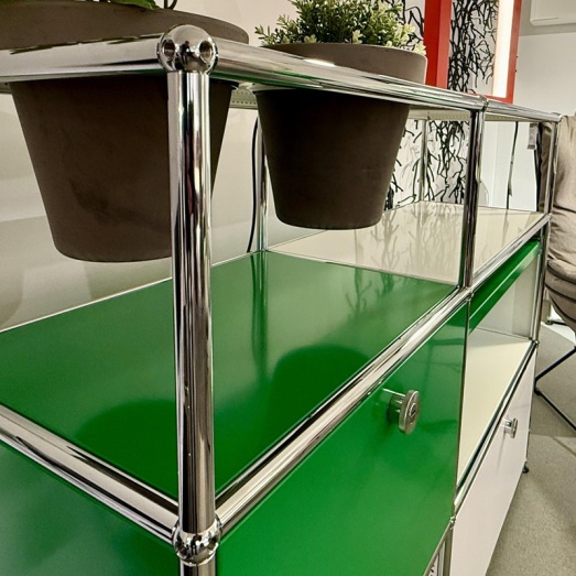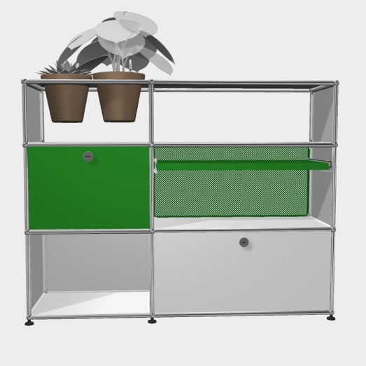Stahlrohrrahmen verchromtMetalltablare reinweiß und grün lackiertdavon 1x Rückwand perforiert2x Klappe, 1x Auszugtablar,2x Töpfe basaltBreite 125+3 cm, Tiefe 35+3cm, Höhe 99cm