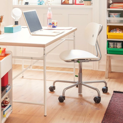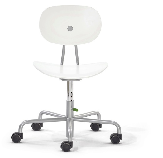 Design Peter Horn, 2005/2006Gestell silber, RAL 9006Formholz Buche weiss lackiert, RAL 9010mit Rollen SicherheitstechnikSitzhöhe 30-41,5cmfür Körpergröße etwa von 1,10 bis 1,60m
