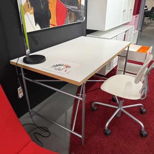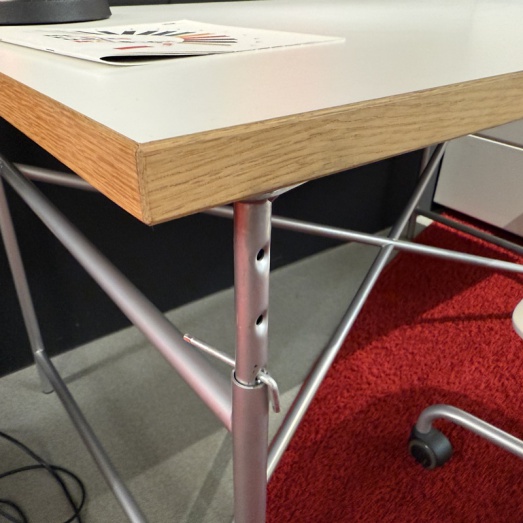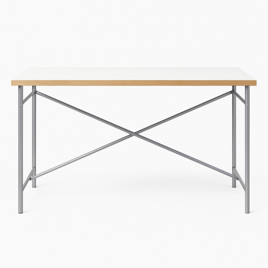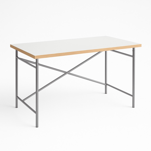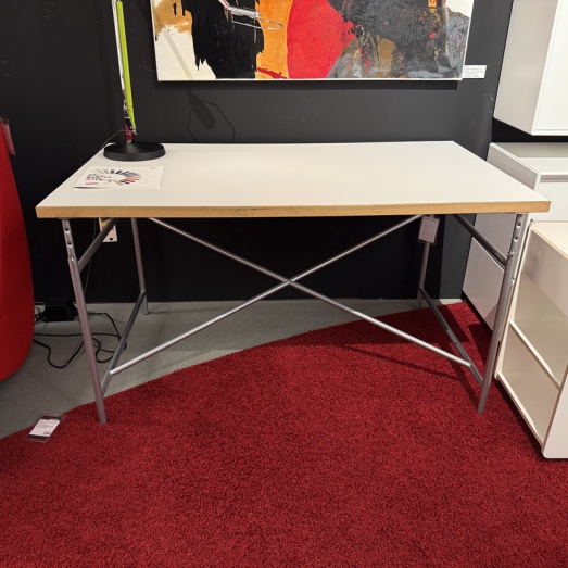 Design Egon Eiermann, 1953Gestell Lack Silber RAL 9006, höhenverstellbarPlatte Melamin weiß beschichtetBreite 120cm, Tiefe 70cmmit Kante Eiche massiv St=28mmHöhe 55-72cm