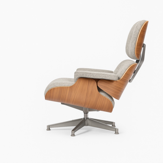 Design Charles & Ray Eames 1956Fuß komplett Alu poliertSchale Nussbaum schwarz pigmentiertBezugmaterial Stoff 0500 Nubia Farbe 09 elfenbein/forestinkl. Filzgleiter für ParkettHocker B 63cm, H 42cm, T 56cmChair B 84cm, T 85cm, H 89cm