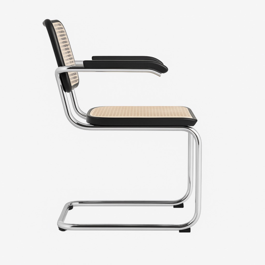Design Marcel Breuer, 1929/30Sitz und Rücken in Rohrgeflechtinkl. Kunststoff StützgewebeHolzteile Buche gebeizt TP29 schwarzGestell Rundrohr verchromt 25 x 2mminkl. Filzgleiter für ParkettSitzhöhe 46cm, Armlehnhöhe 67cm,Höhe 82cm Breite 58cm, Tiefe 62cm