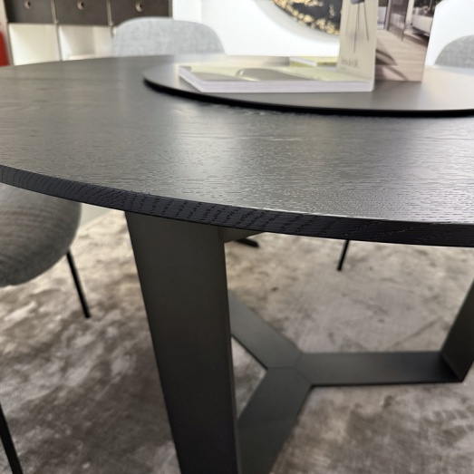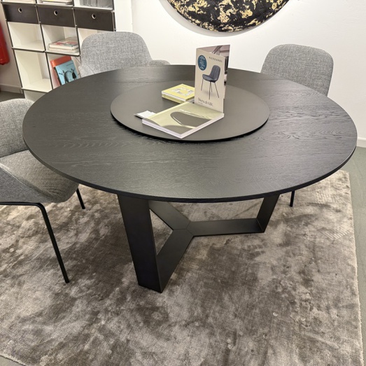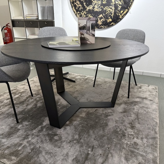 Design Gil Coste 2017Massivholzplatte brettverleimtEiche 14 schwarz gebürstet, matt lackiertGestell Flachstahl auf Gehrung verbundengebürstet und anthrazit pulverbeschichtetinkl. 'Lazy Susan' Drehplatte D=70cmPlattenstärke 2,8cm Kante leicht gefastDurchmesser 140cmHöhe 74,5cm