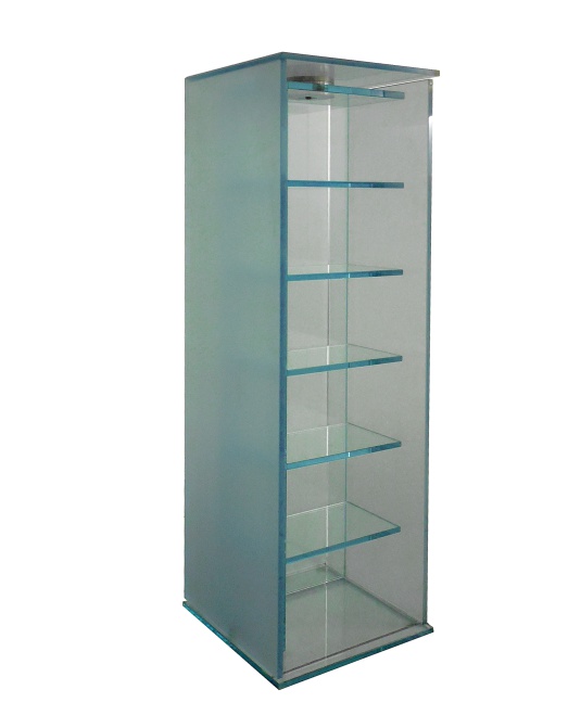 Kubus für 120 CD´sAusführung Satinato, geätztes GlasFloatglas 10mmDrehelement und Führung EdelstahlBreite 28cm, Tiefe 28cm, Höhe 91cm