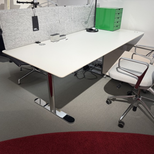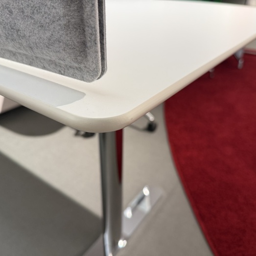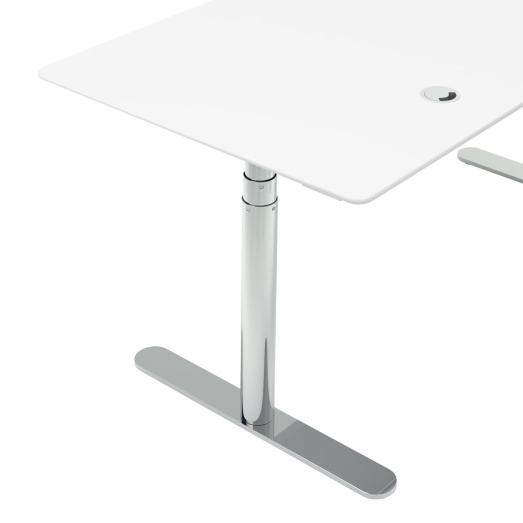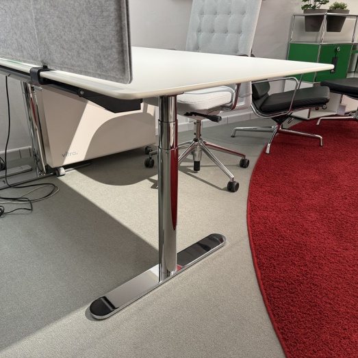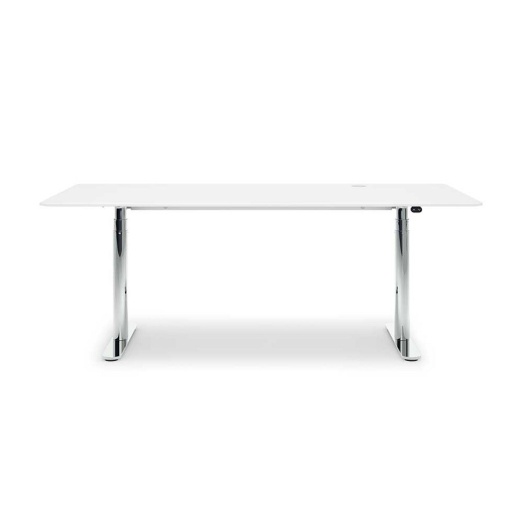 Arbeitstisch elektrisch höhenverstellbar Ansteuerung über zwei Drucktasten in der PlatteTischplatte 23mm Laminat gefaste Kante auf 16mm, Snow 38 Gestell DL11 runde Beine, verchromt inkl. Kabeldurchführung und Lampenhalter B 180,3cm T 82,2cm H 63,5-127cm