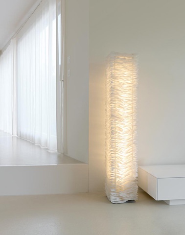 Gestell Stahl pulverbeschichtet weißalu Polyestervlies schwer entflammbarinkl.LED 64W 2700K 2300lm CRI>80 Konverter integriert, Netzkabel 300cmDimmschalter oben in Leuchte Breite 29cm Höhe 150cm Tiefe 29cm