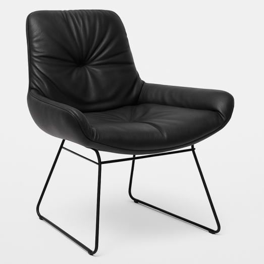 Design Birgit HoffmannVariante uni, mit kurzer ArmlehneBezug Leder Sahara Ebony 60009Drahtgestell 1.1 Metall schwarz ME001inkl. KunststoffgleiterSitzhöhe 47 cm