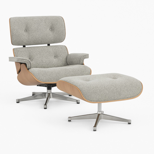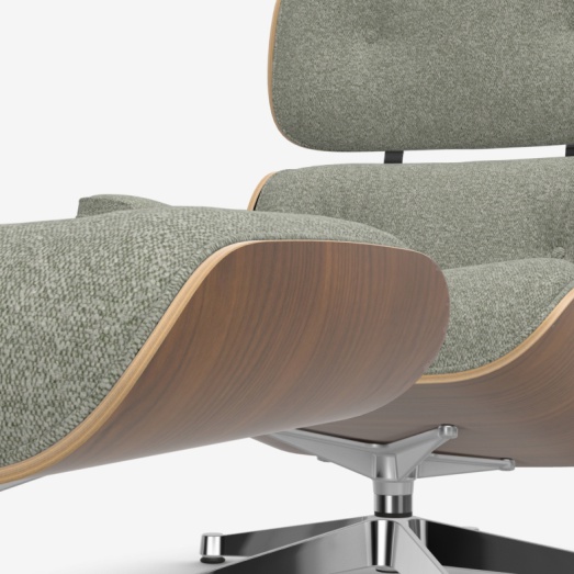 Design Charles & Ray Eames 1956Fuß komplett Alu poliertSchale Nussbaum schwarz pigmentiertBezugmaterial Stoff 0500 Nubia Farbe 09 elfenbein/forestinkl. Filzgleiter für ParkettHocker B 63cm, H 42cm, T 56cmChair B 84cm, T 85cm, H 89cm