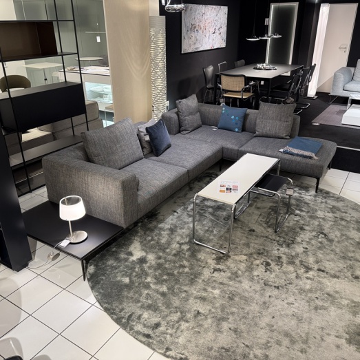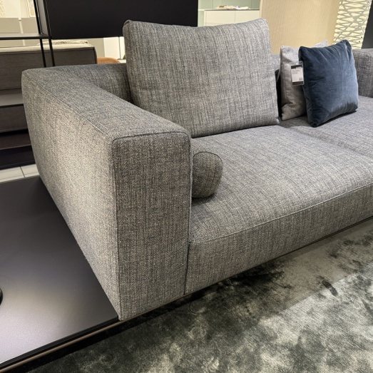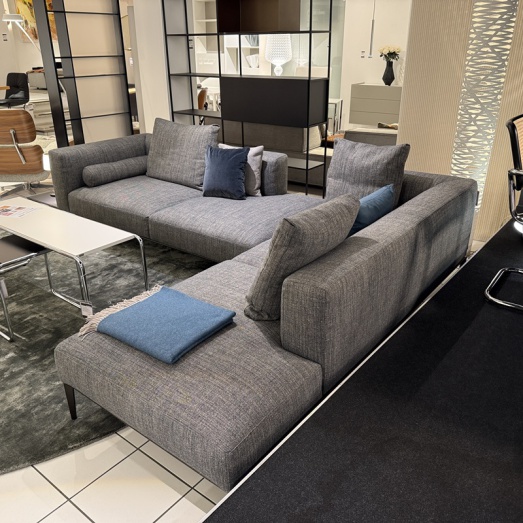 Design EOOSPolsterung Variante 1, legere OptikFeder-Inlett + Kaltschaum-SandwichaufbauFüße pulverbeschichtet matt bronzeStoff Togba 25, 7852 blue bronzeAblageboard satiniertes Glas schwarz(neu in Saddle Leder)Sitzhöhe 44cm, Sitztiefe 58/68cm Breite 355cm, Tiefe 230cm, Höhe 70cm